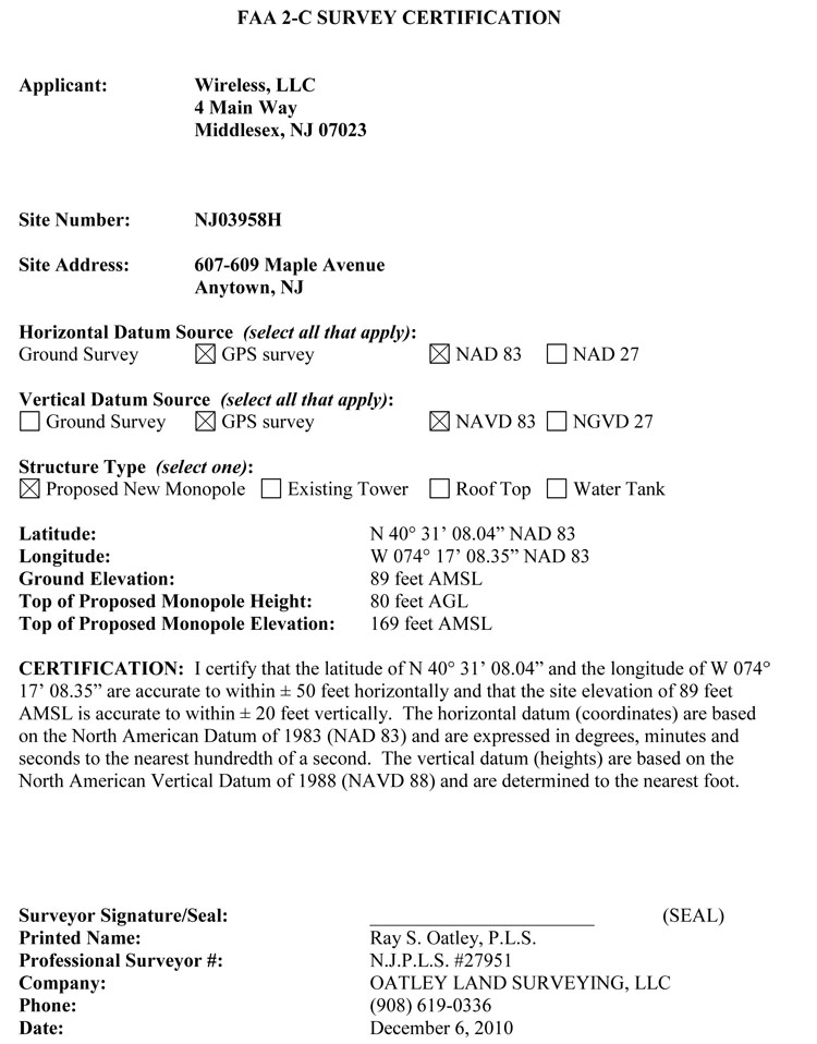 Wireless communication companies and tower owners are required by the Federal Aviation Administration (FAA) to submit 2C or 1A Certifications for sites where towers or antennas are installed or are planned to be installed. Certification includes surveying using GPS to determine the latitude and longitude of the tower or structure along with elevations of the tower, structure and installed or proposed antennas.